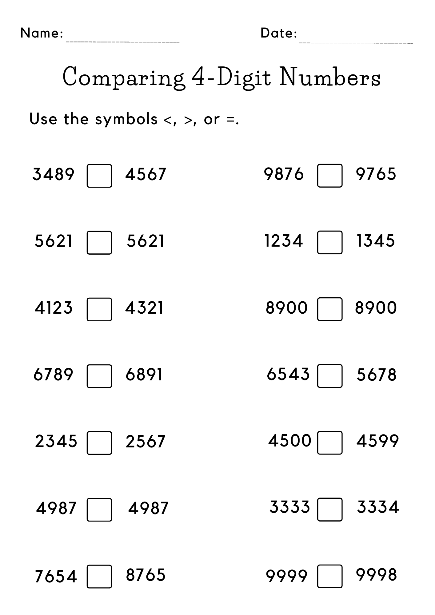 One type of worksheet may ask students to compare two three-digit numbers and determine which number is greater, less than, or equal to the other. This can help students practice using the greater than (>), less than (<), and equal to (=) symbols to compare numbers.