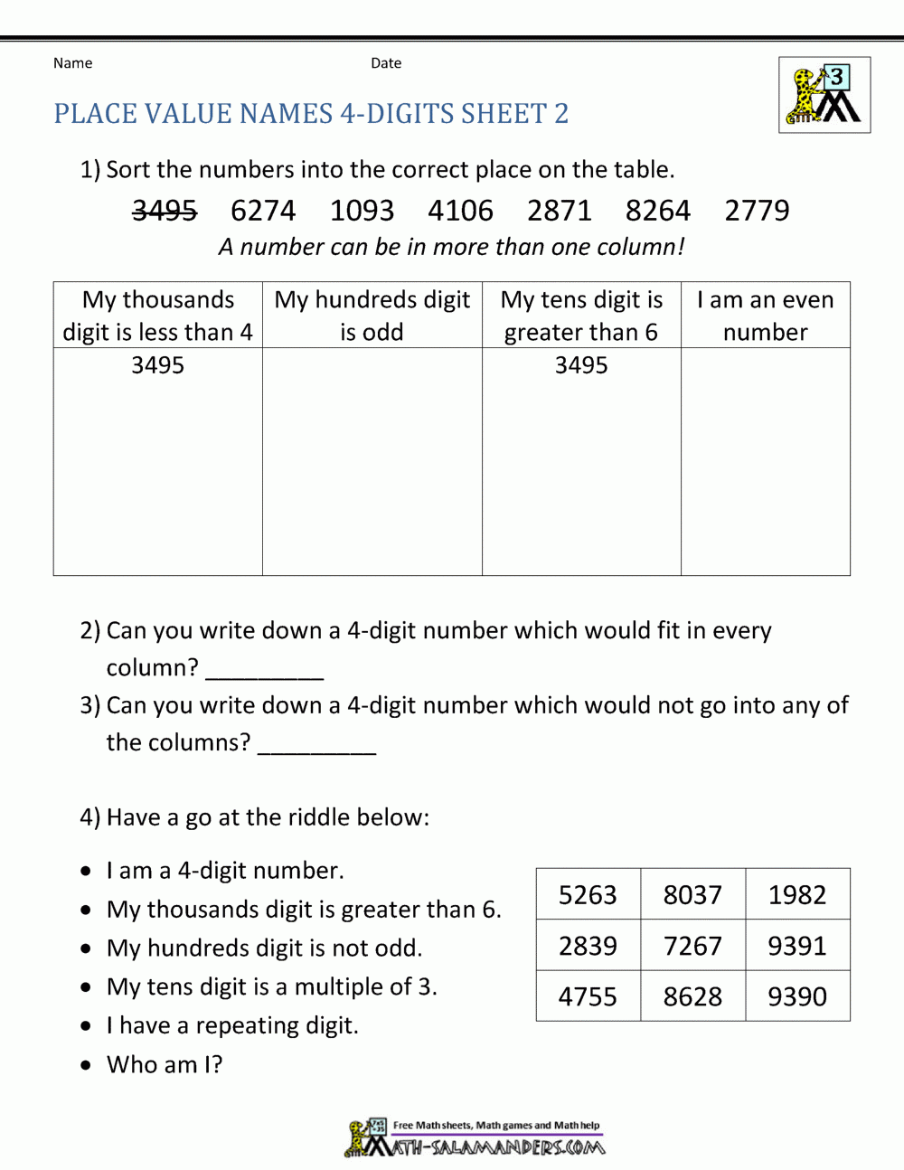 One common exercise found in these worksheets is asking students to identify the place value of a specific digit in a given number. For example, students may be asked to determine the value of the hundreds, tens, or ones place in a 4-digit number. This helps students understand the positional value of each digit in a number.