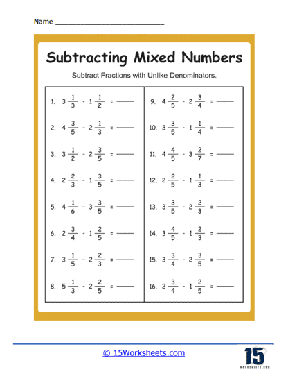 These worksheets typically provide a variety of problems for students to solve, ranging from simple additions to more complex ones. By working through these problems, students can improve their understanding of how to add mixed numbers with unlike denominators and develop confidence in their abilities.