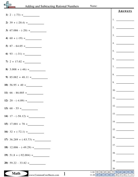 These worksheets typically contain a mix of addition and subtraction problems involving rational numbers. Students are required to apply the rules of adding and subtracting fractions, decimals, and integers to solve the problems. By doing these worksheets, students can improve their understanding of rational numbers and develop their problem-solving skills.