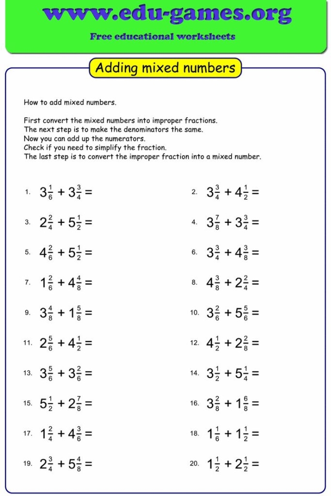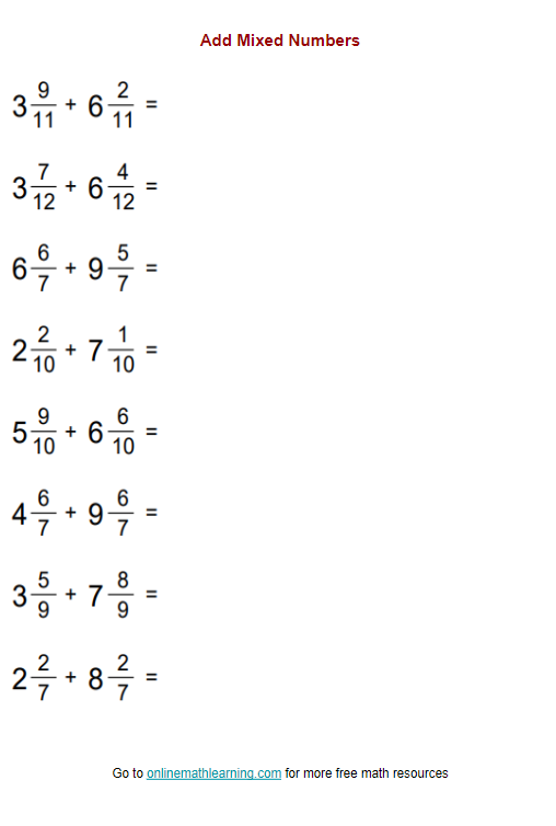 These worksheets provide students with the opportunity to practice adding mixed numbers with unlike denominators in a structured and repetitive manner. By working through these problems, students can improve their understanding of fractions, develop their problem-solving skills, and gain confidence in their math abilities.