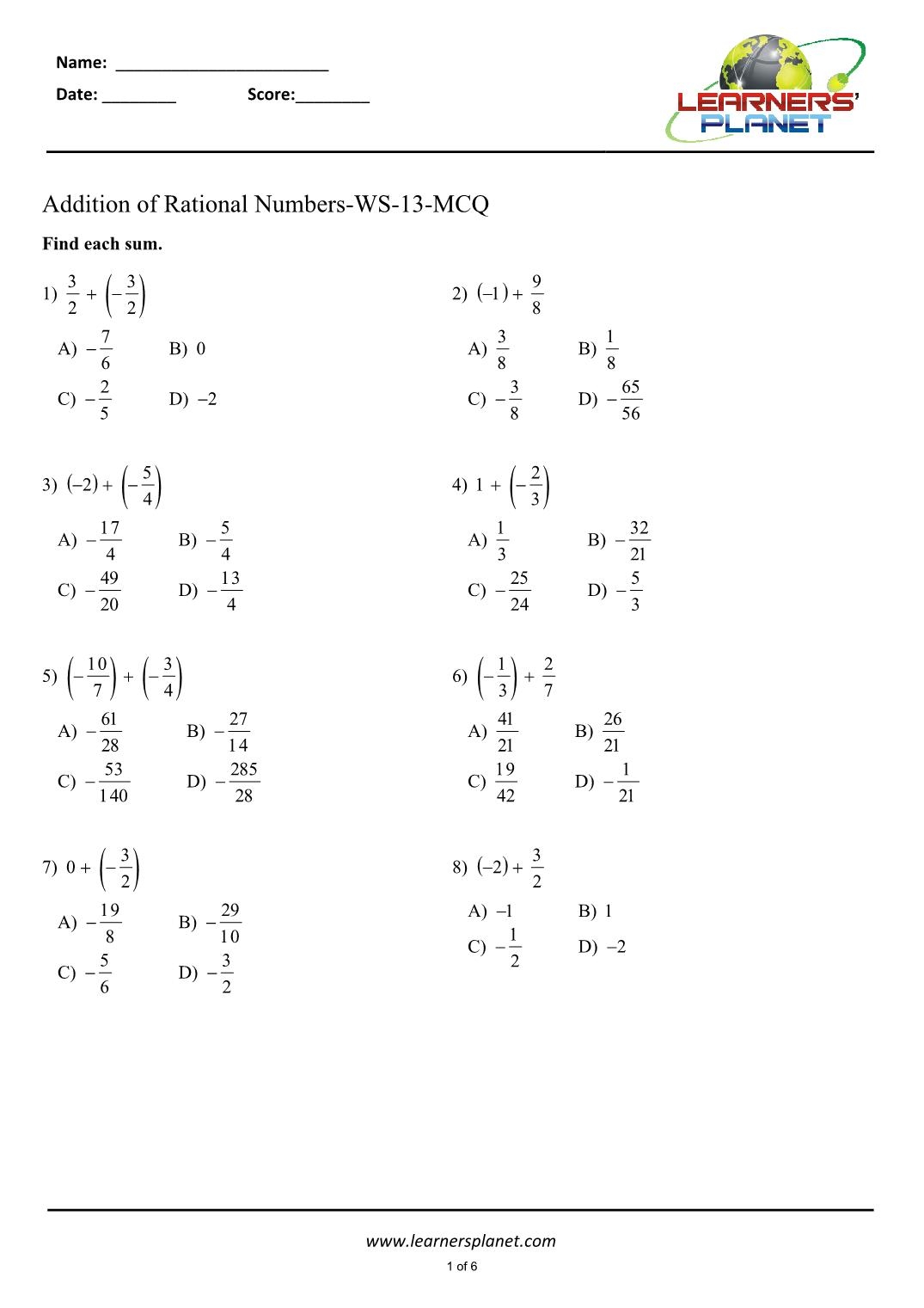 One way to practice adding rational numbers is through worksheets. These worksheets provide students with a variety of problems to solve, allowing them to practice adding fractions and improve their problem-solving skills. By completing these worksheets, students can gain confidence in their ability to add rational numbers and become more comfortable working with fractions.