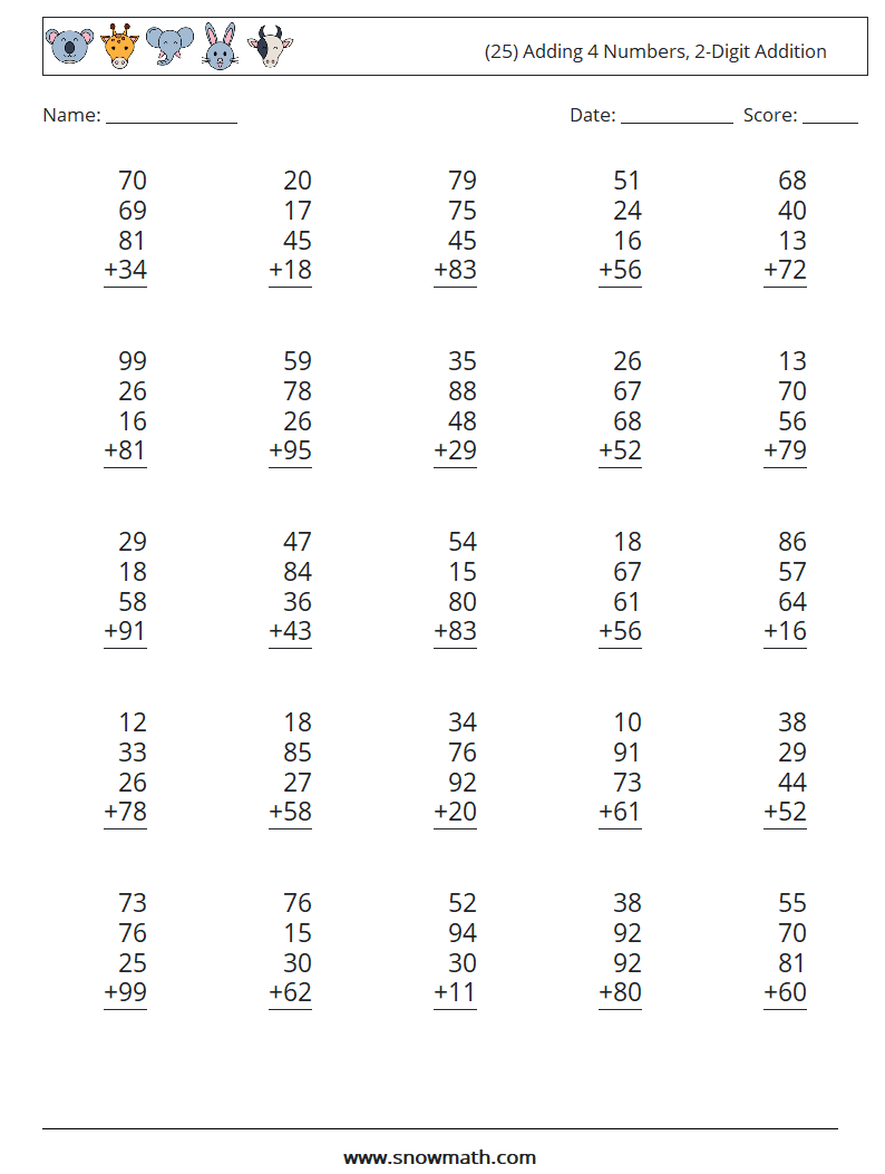 Adding two-digit numbers worksheets typically include a series of problems where children are required to add two numbers together. These worksheets can range in difficulty, starting with simple problems and gradually increasing in complexity as children progress. By providing a variety of problems, children can practice adding different combinations of two-digit numbers.