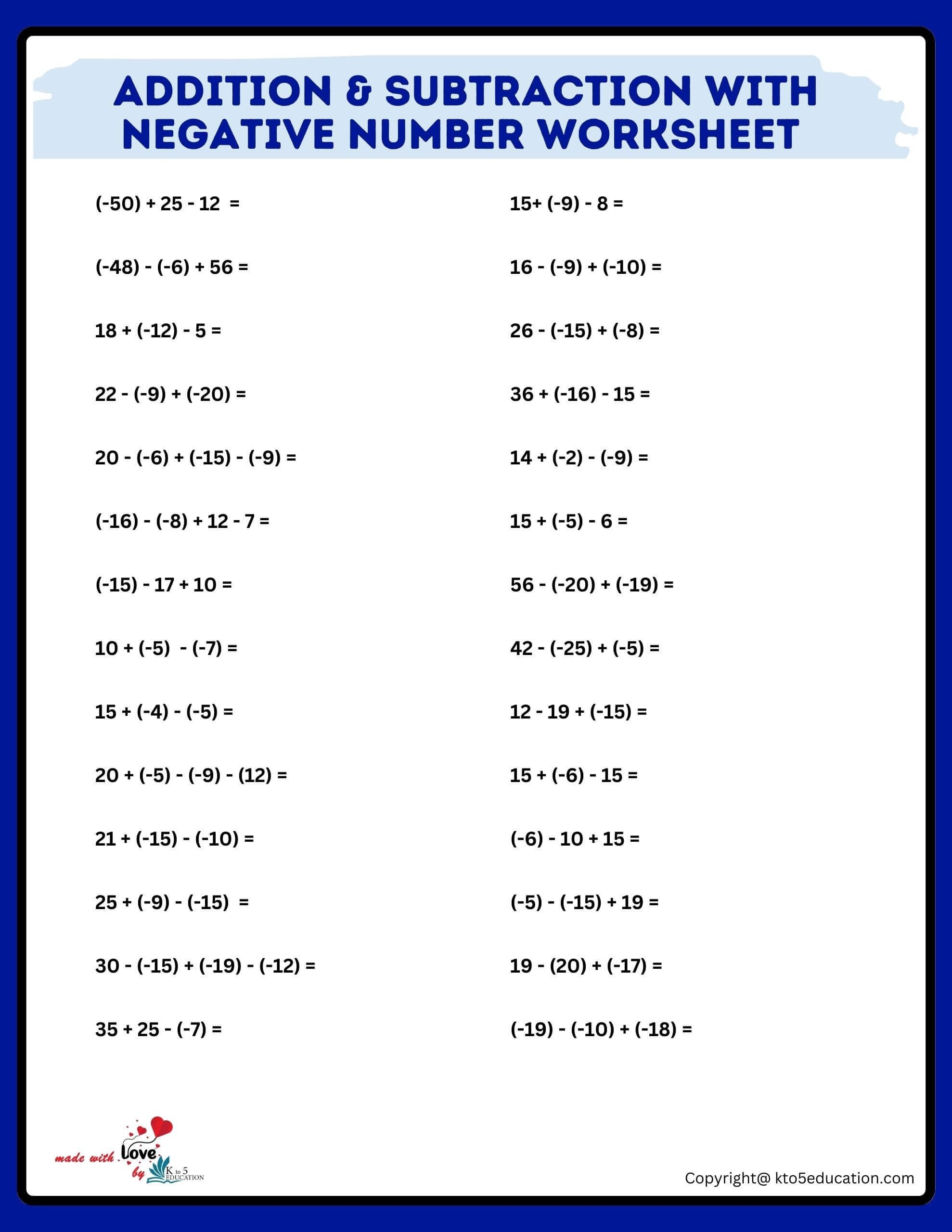 In conclusion, addition and subtraction of negative numbers can be challenging for students, but with the use of worksheets, they can improve their skills and become more confident in their abilities. By practicing regularly and seeking help when needed, students can master these concepts and excel in their mathematical studies.