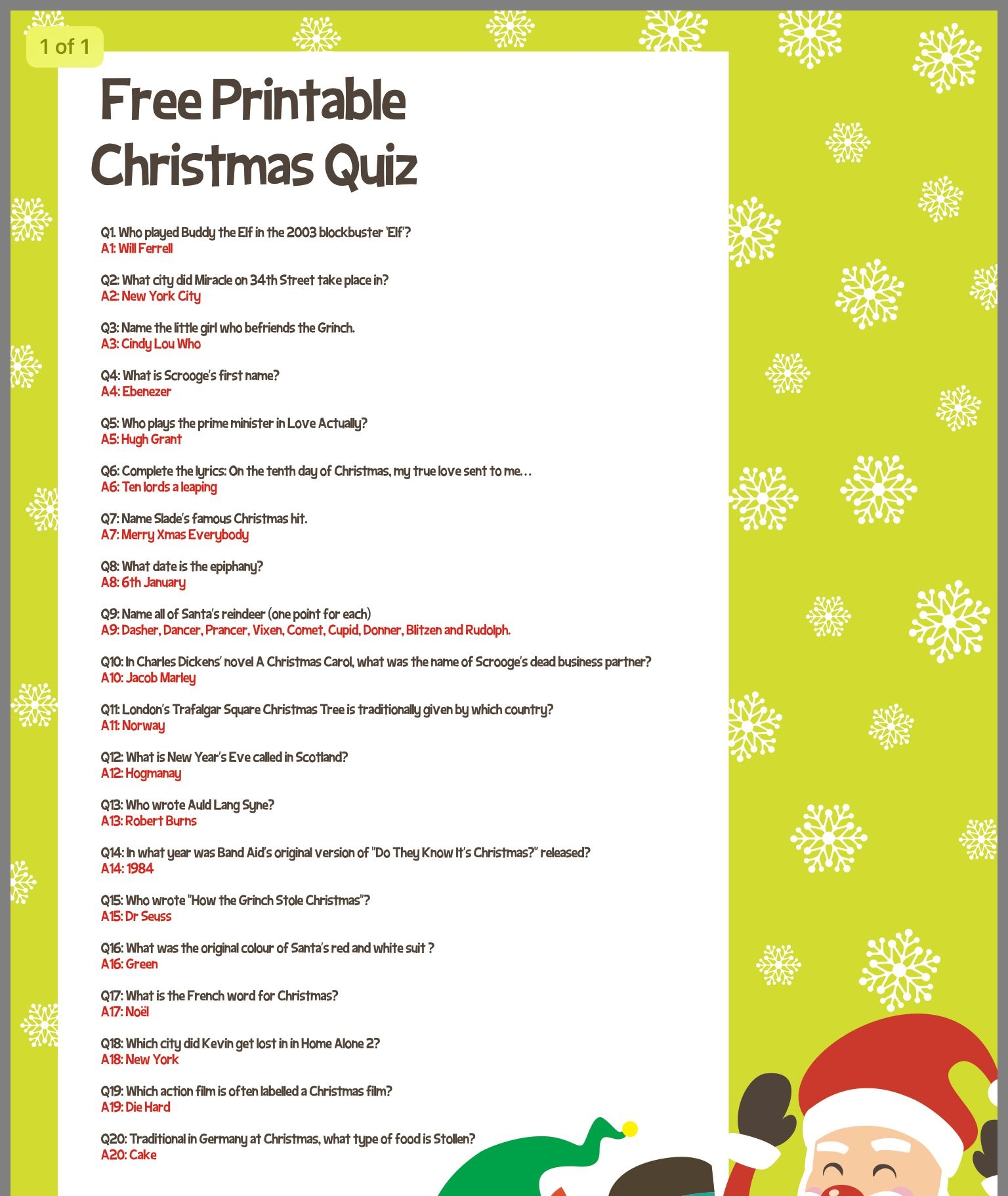 Playing a Christmas picture quiz with answers printable is a great way to engage with the holiday spirit and have some festive fun. It’s perfect for all ages and can be enjoyed with friends and family. So gather around, grab some hot cocoa, and test your Christmas knowledge with this entertaining quiz. Who knows, you might even learn something new about this magical holiday!