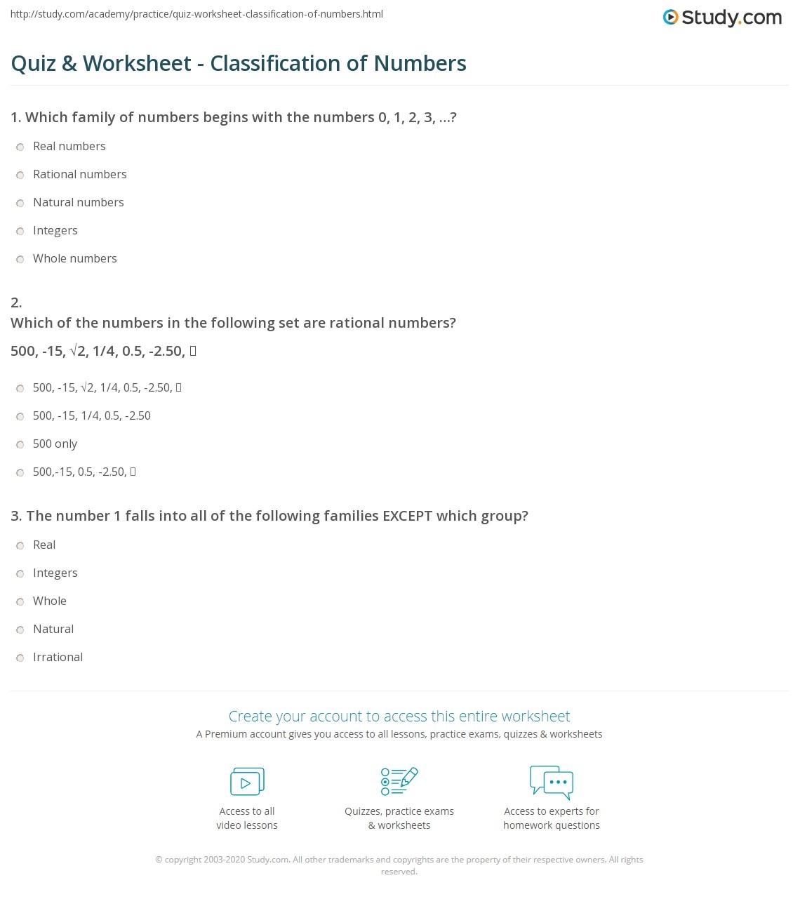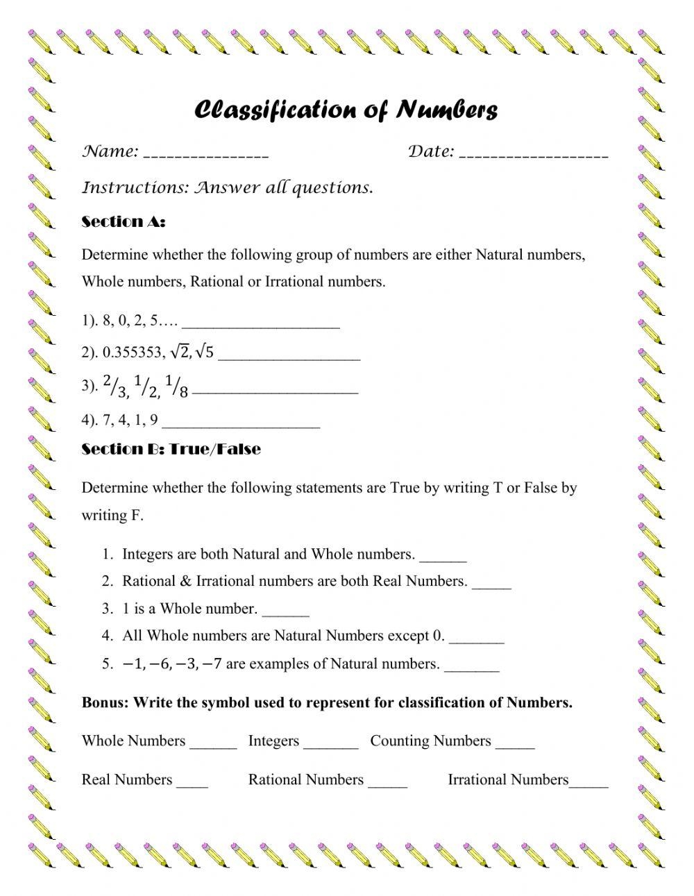Classification of Numbers Worksheet