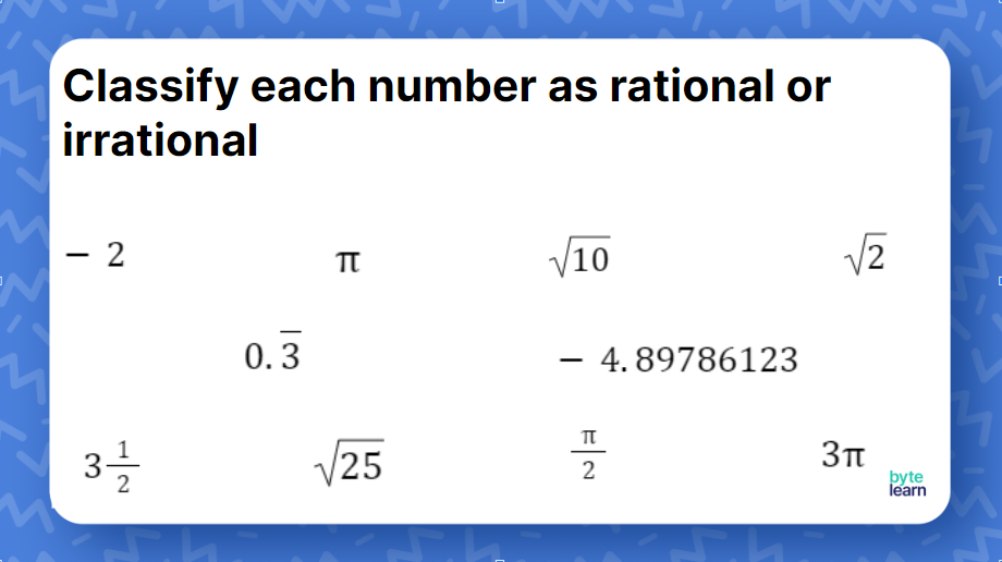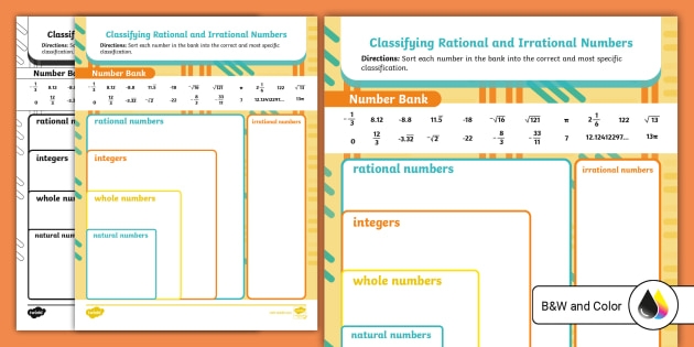 A classify rational numbers worksheet is a tool that allows students to practice identifying and sorting different types of rational numbers. These worksheets typically include a variety of questions that ask students to determine whether a given number is a whole number, integer, rational number, or irrational number. By completing these worksheets, students can strengthen their understanding of rational numbers and improve their problem-solving skills.