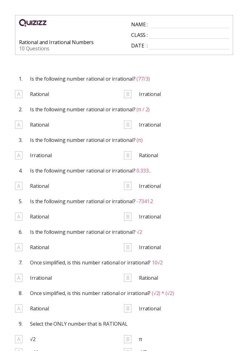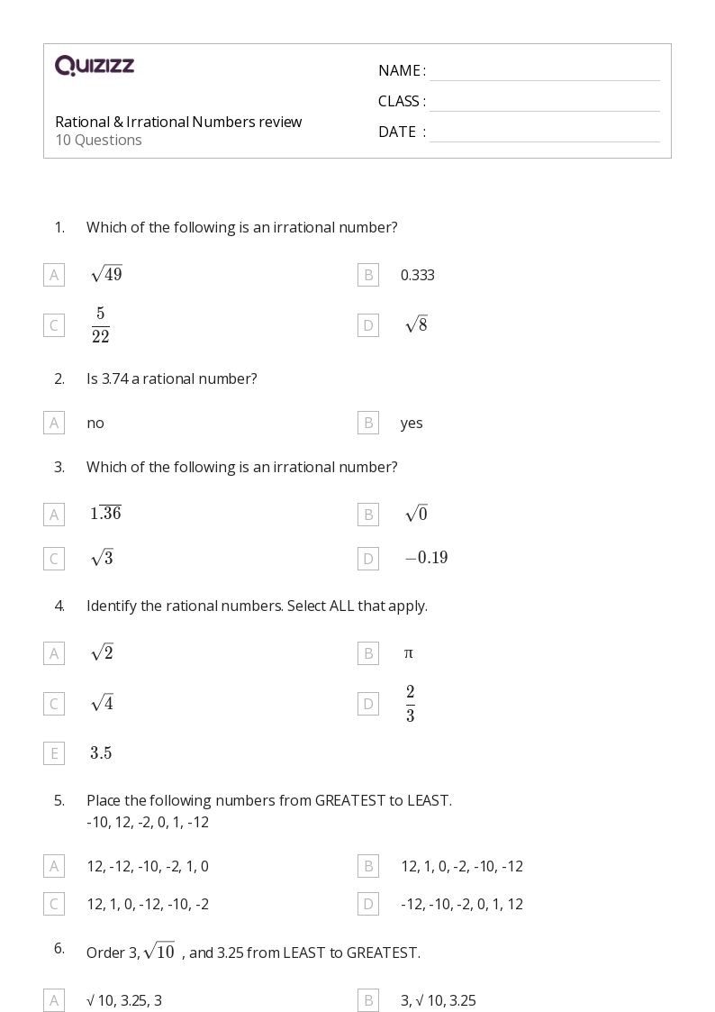 On a typical worksheet, students may be presented with numbers such as √2, 1/3, π, and 0.5. Students must determine which of these numbers are rational and which are irrational. This requires knowledge of the properties of rational and irrational numbers, as well as an understanding of how to identify them based on their decimal representations.
