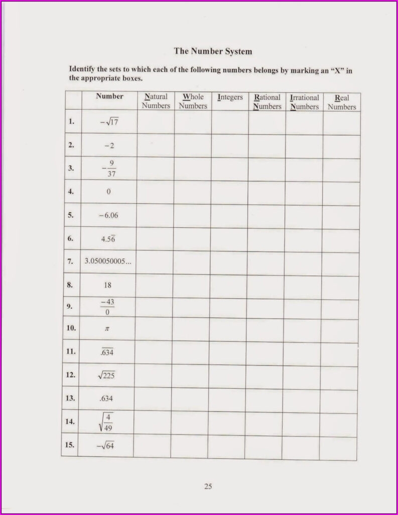 Classifying real numbers can be a challenging task for students, as there are various types of numbers to consider. To help students practice and master this concept, teachers often provide worksheets with exercises that require them to classify different numbers. These worksheets typically include a mix of rational, irrational, whole, integer, and natural numbers for students to categorize.