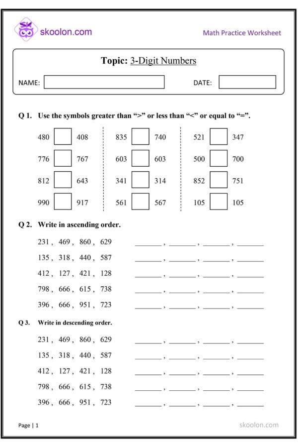 One common type of exercise found in these worksheets is comparing numbers in ascending or descending order. Students are given a list of 3-digit numbers and are asked to arrange them from smallest to largest or vice versa. This helps students visualize the relationship between numbers and reinforces the concept of numerical order.
