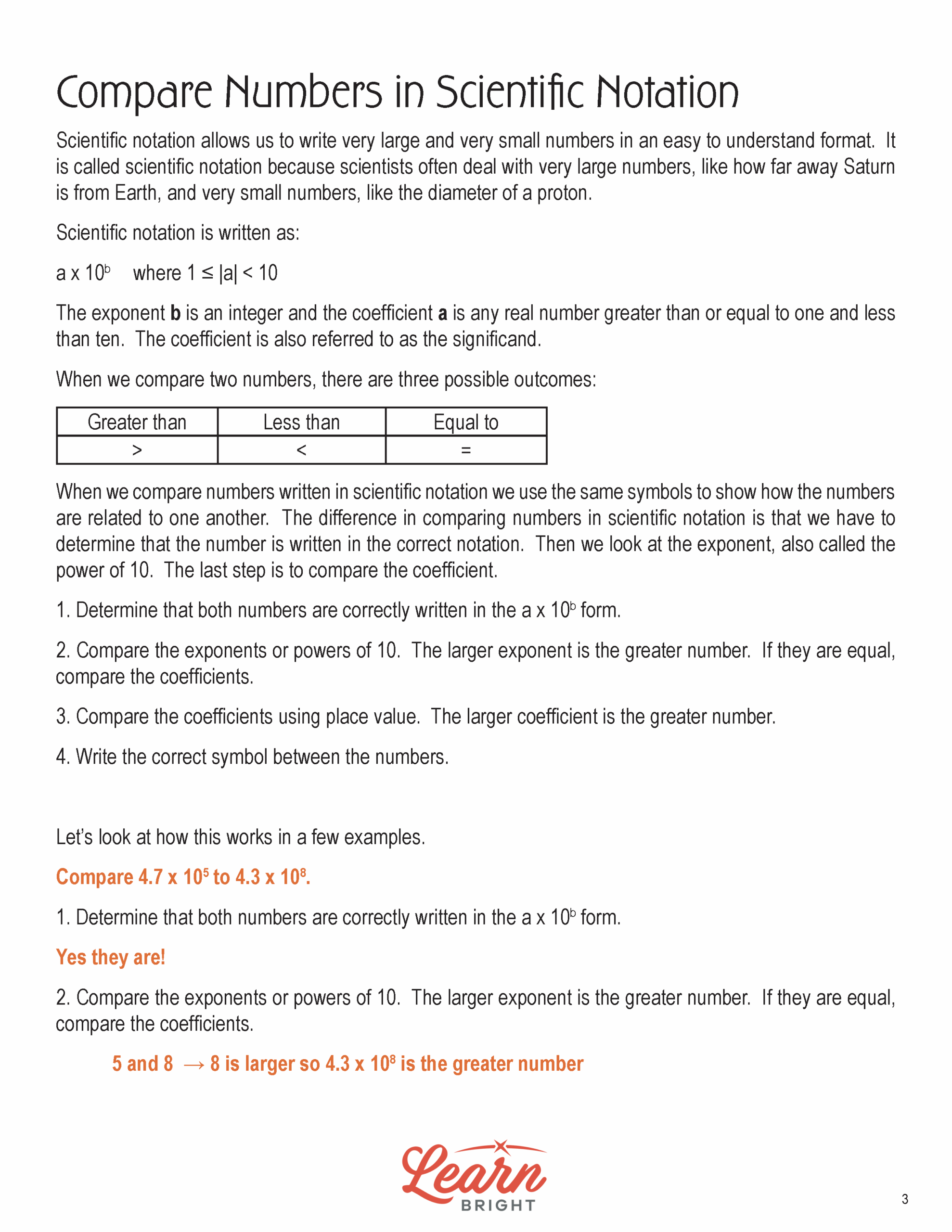 When it comes to working with very large or very small numbers, scientific notation is a useful tool that simplifies the process. In scientific notation, numbers are written as a coefficient multiplied by 10 raised to a power. This allows for easier comparison of numbers and makes calculations more manageable. In this worksheet, students will practice comparing numbers in scientific notation to reinforce their understanding of this concept.