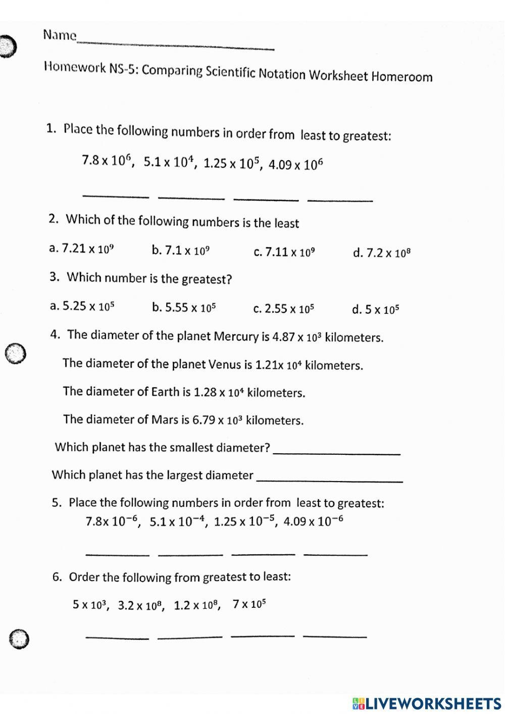 Students will encounter various scenarios in the worksheet where they will need to compare numbers in scientific notation. Some questions may involve comparing numbers with different exponents, requiring students to convert them to the same power before making a comparison. Other questions may involve comparing numbers with negative exponents, which adds an additional layer of complexity to the task.