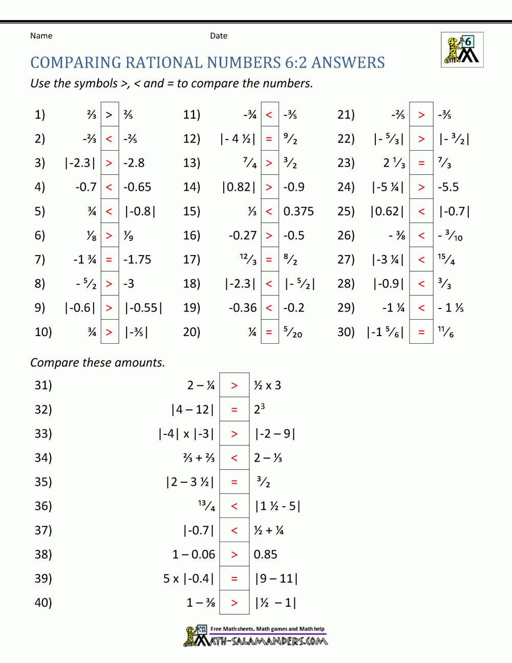 These worksheets typically contain a variety of problems that require students to compare rational numbers using symbols such as <, >, and =. By completing these worksheets, students can improve their understanding of how rational numbers relate to each other and develop their problem-solving skills.