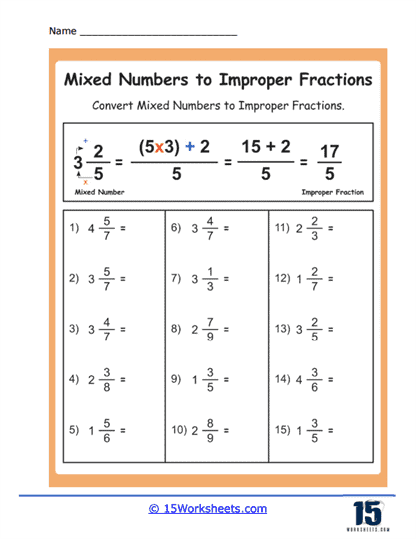 Another task on the worksheet may present a mixed number like 3 2/5 for conversion. Following the same procedure, students would compute (3 * 5) + 2 to get 17 as the numerator, resulting in the improper fraction 17/5.