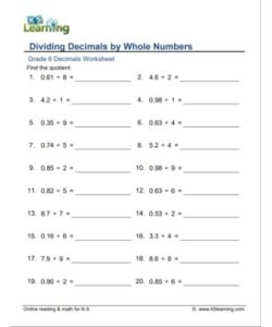In addition to providing practice problems, dividing decimals by whole numbers worksheets also often include helpful tips and explanations to guide students through the problem-solving process. These resources can be valuable tools for students who are struggling to understand the concept or who need additional support in mastering the skill. By using these worksheets, students can enhance their understanding of dividing decimals by whole numbers.