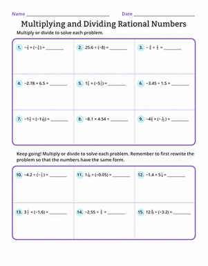 Students may also encounter word problems on a division of rational numbers worksheet. These problems require students to apply their knowledge of division of fractions to real-life situations. By solving these word problems, students can see the practical applications of division of rational numbers in everyday scenarios.