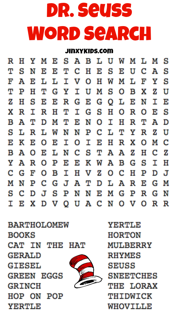 2. Word Searches: Challenge your mind with Dr. Seuss themed word searches that will have you searching for words like “Whoville,” “Truffula Trees,” and “Green Eggs and Ham.” It’s a fun way to test your knowledge of Dr. Seuss’s stories!