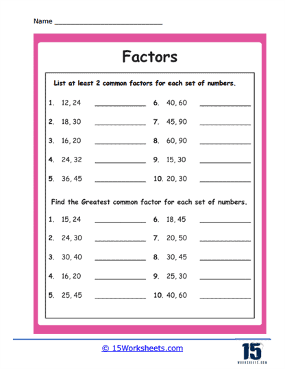 Another type of exercise that may be included in factoring numbers worksheets is finding the greatest common factor (GCF) of two or more numbers. This involves identifying the largest factor that is common to all of the numbers given. By practicing GCF problems, students can develop their problem-solving skills and learn to identify common factors between numbers more easily.