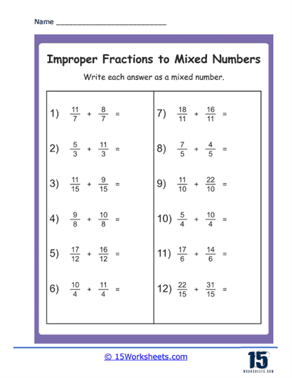 These worksheets typically include exercises that require students to convert improper fractions to mixed numbers and vice versa. By practicing these problems, students can develop a better understanding of how mixed numbers work and how they relate to fractions.