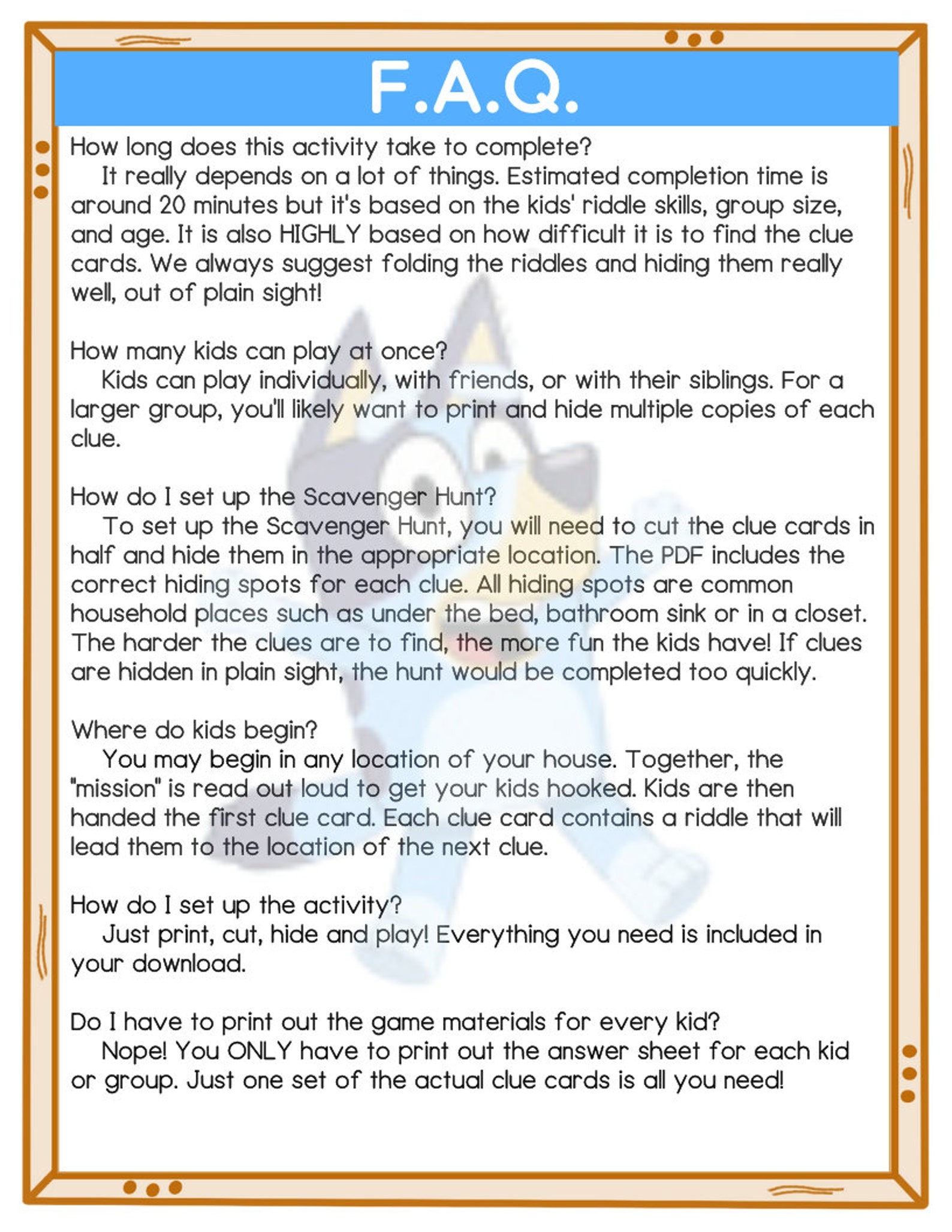 With these simple instructions, you can easily organize a Bluey Scavenger Hunt Game that will keep children entertained and engaged for hours on end. So, what are you waiting for? Print out the instructions, gather the kids, and let the adventure begin!