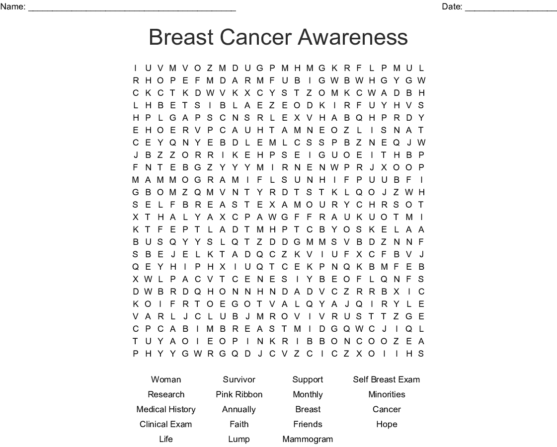 2. Pink Ribbon Word Search: Design a word search puzzle with terms related to breast cancer awareness, such as “support,” “hope,” “strength,” and “awareness.” This game can be a fun and educational activity for all ages, helping to reinforce the importance of early detection and treatment.