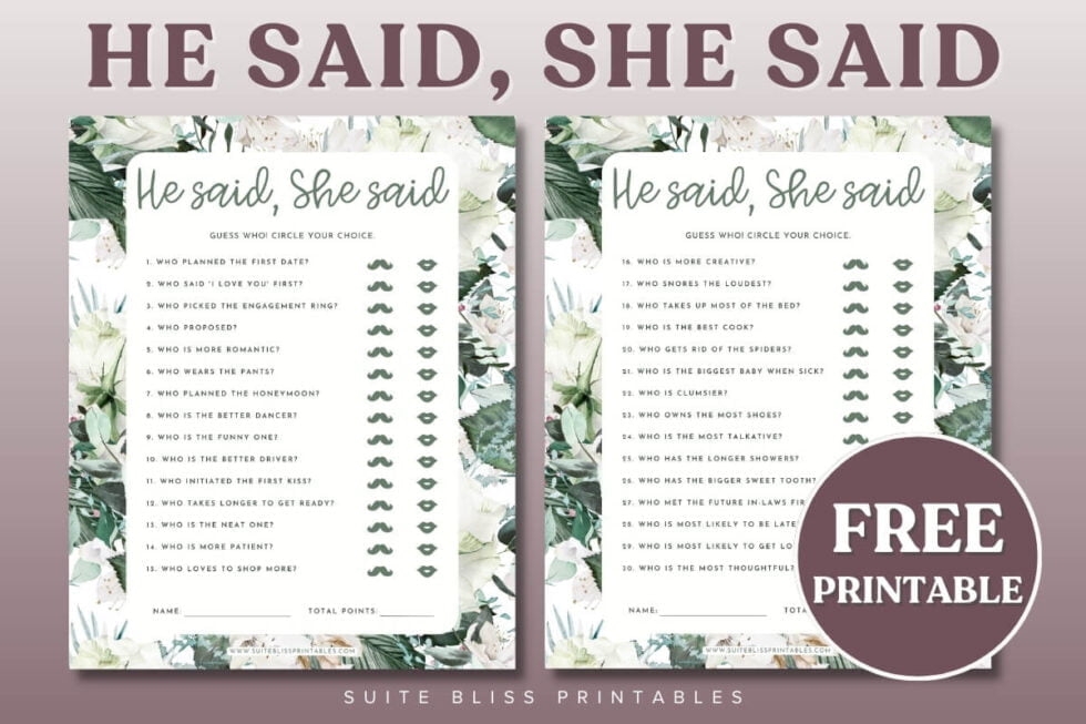 So if you’re looking for a fun and free printable bridal shower game that will get everyone talking and laughing, consider playing He Said She Said. It’s a surefire way to make the celebration memorable and enjoyable for all the guests.