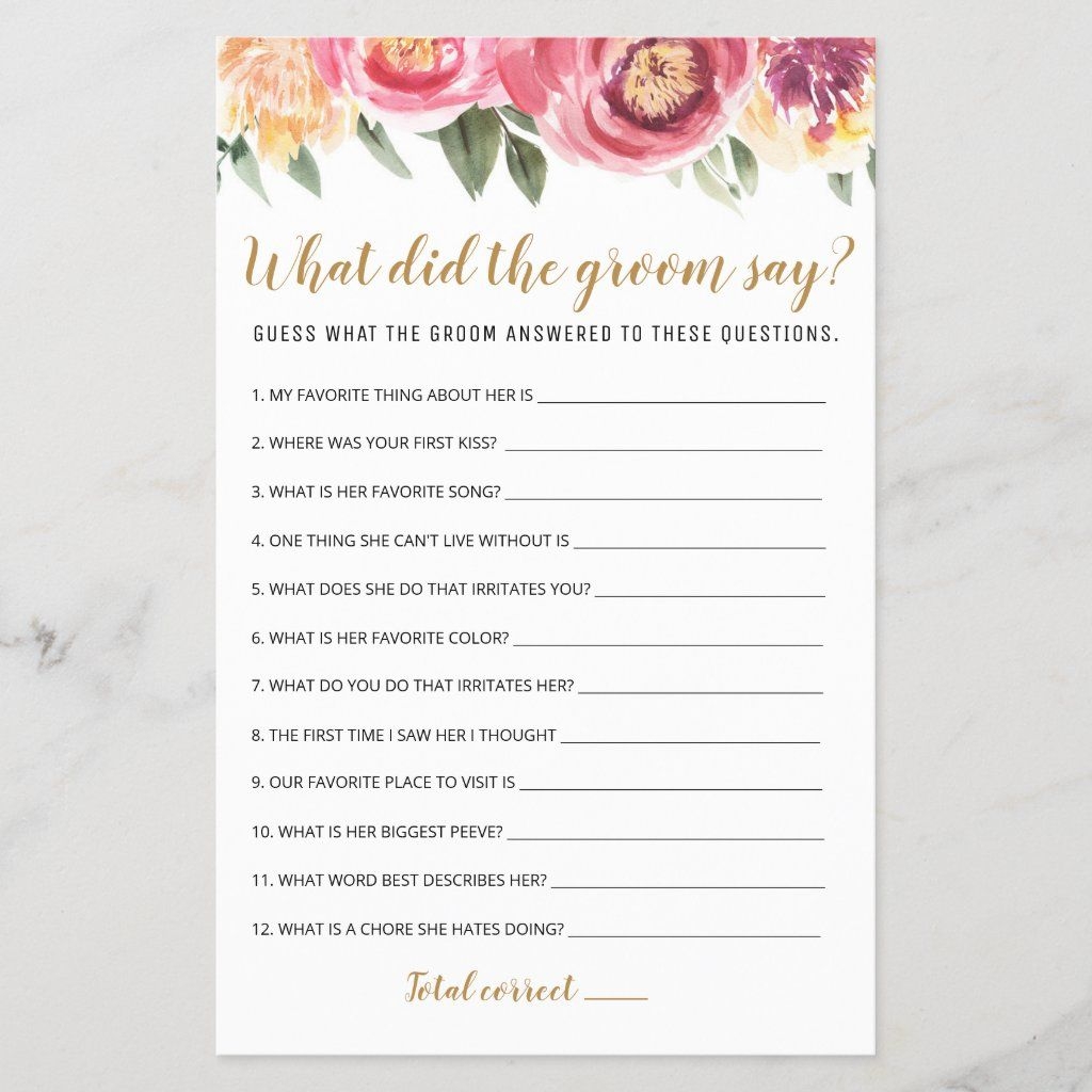 Print out the game cards provided and distribute them to the guests along with pens or pencils. Have the host read out the questions and give the guests a few moments to write down their answers. Once all the questions have been read, reveal the groom’s answers and see who got the most right!