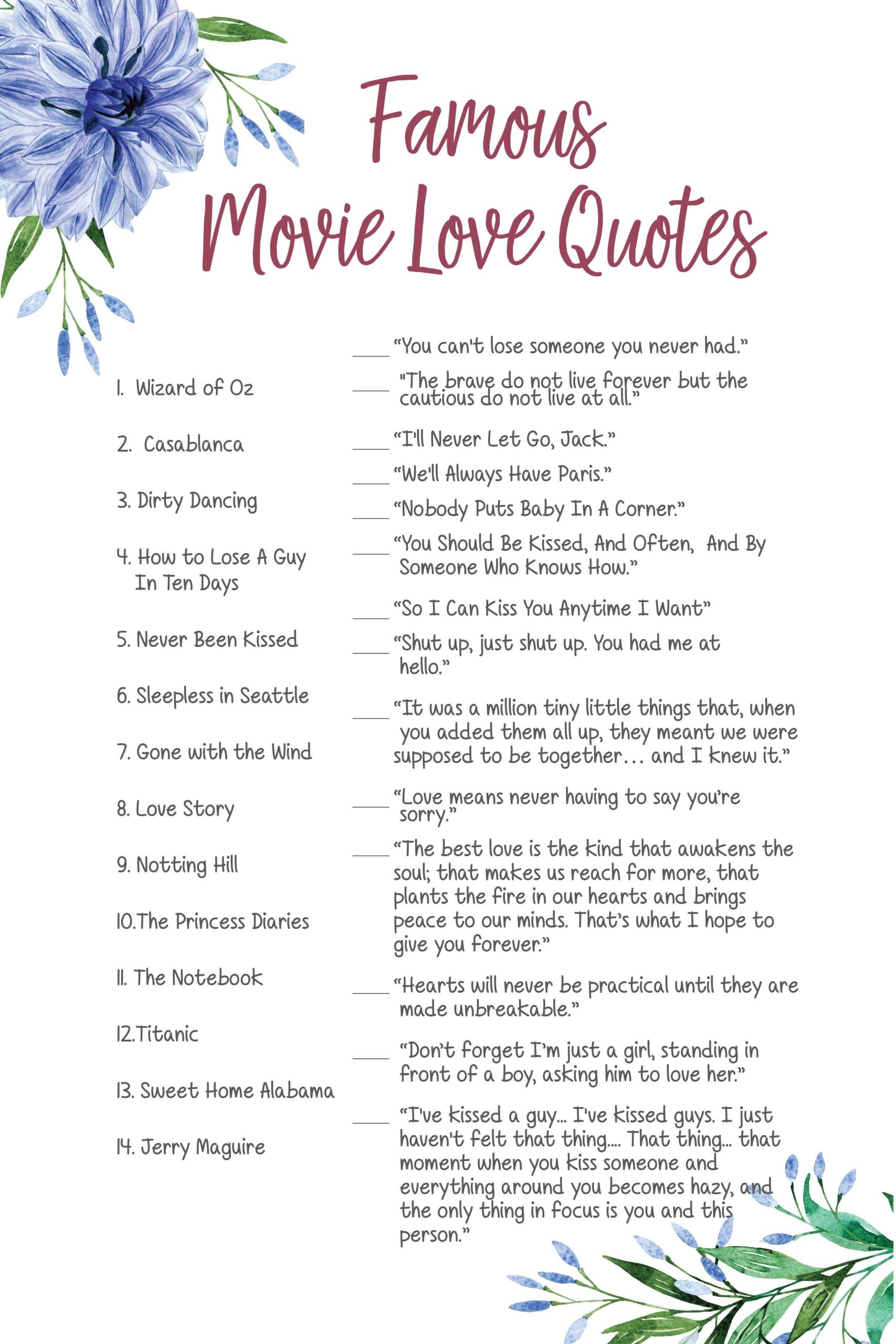 In conclusion, incorporating movie quotes into your bridal shower games is a fun and creative way to entertain your guests. Whether you choose to play a “Movie Quotes” game, a “Movie Love Quotes” game, or a “Movie Charades” game, your guests are sure to have a great time testing their knowledge of popular movies. So, download some free printable bridal shower games featuring movie quotes and get ready for a fun and memorable bridal shower!