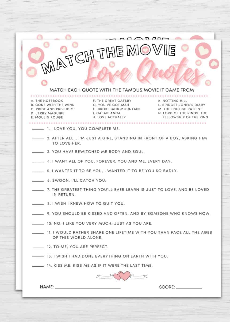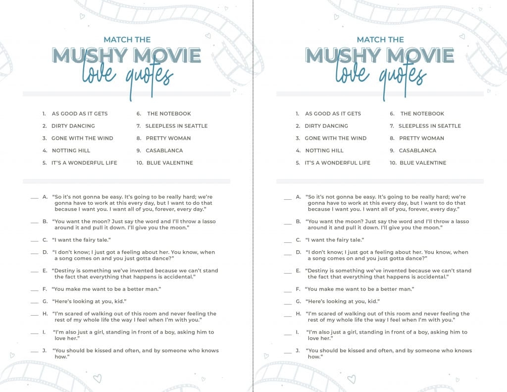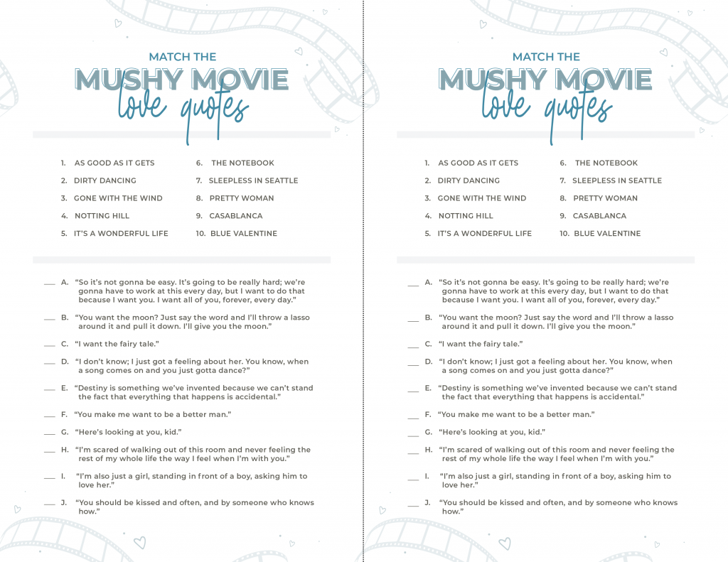 Movie love quotes are some of the most iconic and memorable lines in film history. From classics like “You had me at hello” from Jerry Maguire to “I’ll never let go, Jack” from Titanic, these quotes have a way of tugging at our heartstrings and reminding us of the power of love. What better way to celebrate love and marriage than by playing a game that highlights these romantic moments on the big screen?