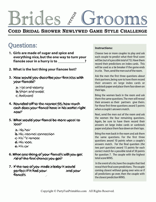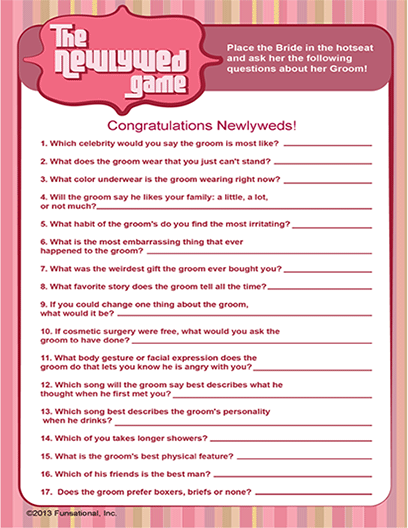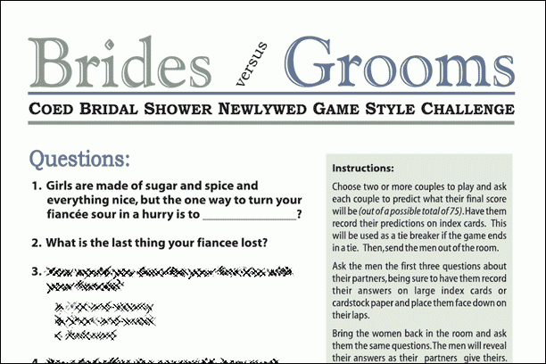 With a free printable newlywed game, all you have to do is download and print out the game cards, grab some pens, and get ready for some laughs. The game typically consists of a series of questions that the couple has to answer separately before revealing their answers to see if they match up.