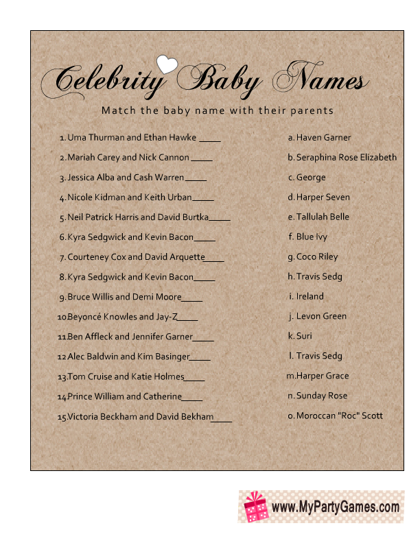 In conclusion, the free printable celebrity baby name game is a fantastic choice for any baby shower celebration. It’s easy to set up, entertaining to play, and creates a memorable experience for all involved. So, why not add this fun and interactive game to your next baby shower and watch as guests have a blast trying to match celebrity parents to their unique baby names!