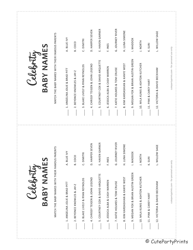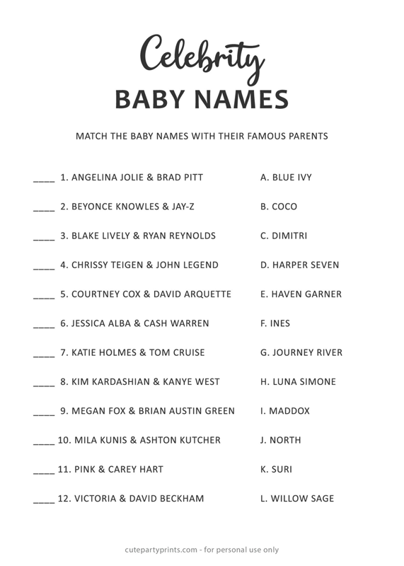 Look no further! The free printable celebrity baby name game is a perfect addition to any baby shower celebration. This game is not only enjoyable but also interactive, as guests try to match the celebrity parents to their unique baby names. It’s a great way to keep everyone engaged and entertained throughout the event.