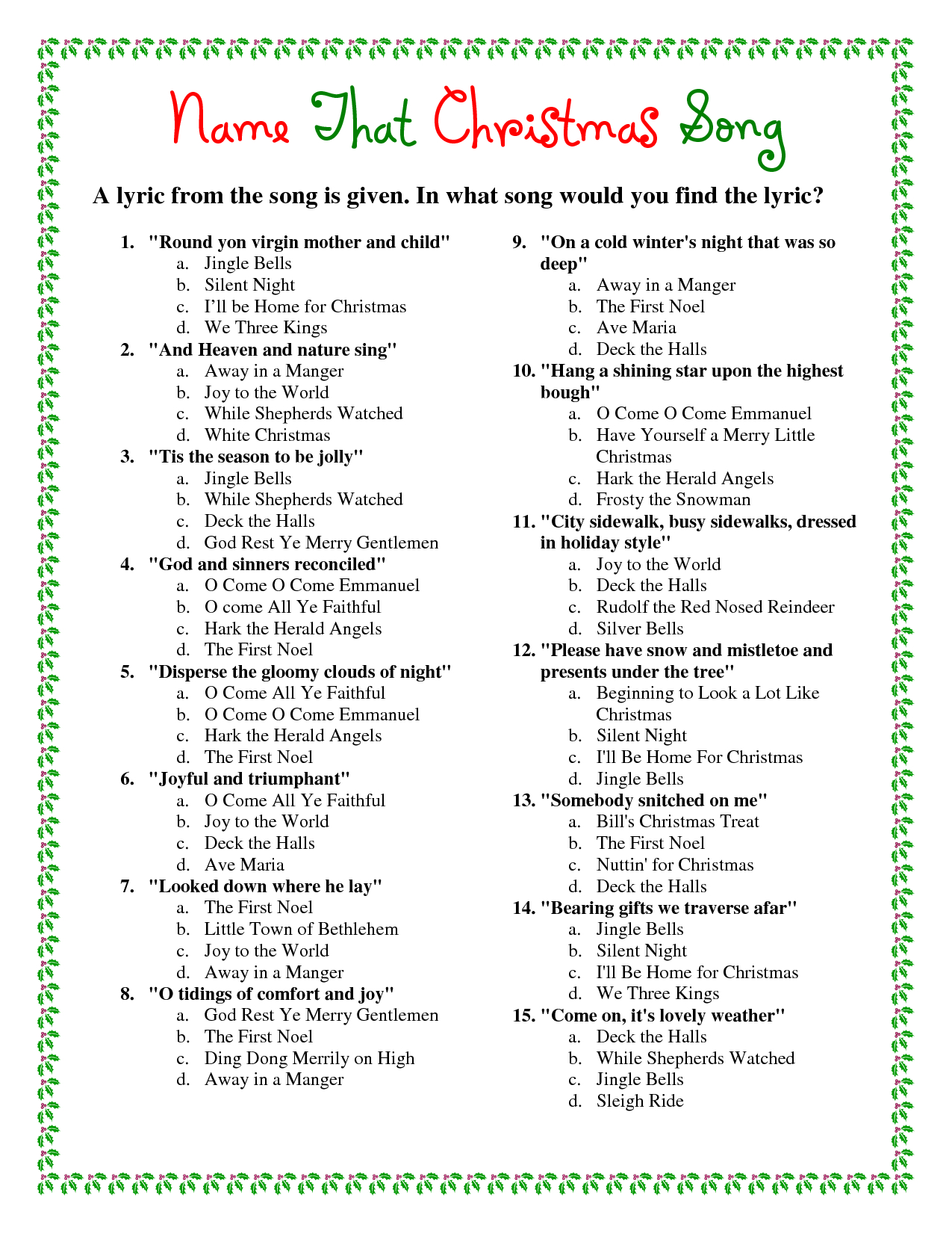 The Free Printable Christmas Lyrics Game is a great way to challenge your guests and see who really knows their holiday tunes. Simply print out the lyrics to popular Christmas songs and leave out key words for players to fill in. Players can compete individually or in teams to see who can correctly complete the most lyrics. This game is sure to bring laughter and joy to your holiday celebrations.