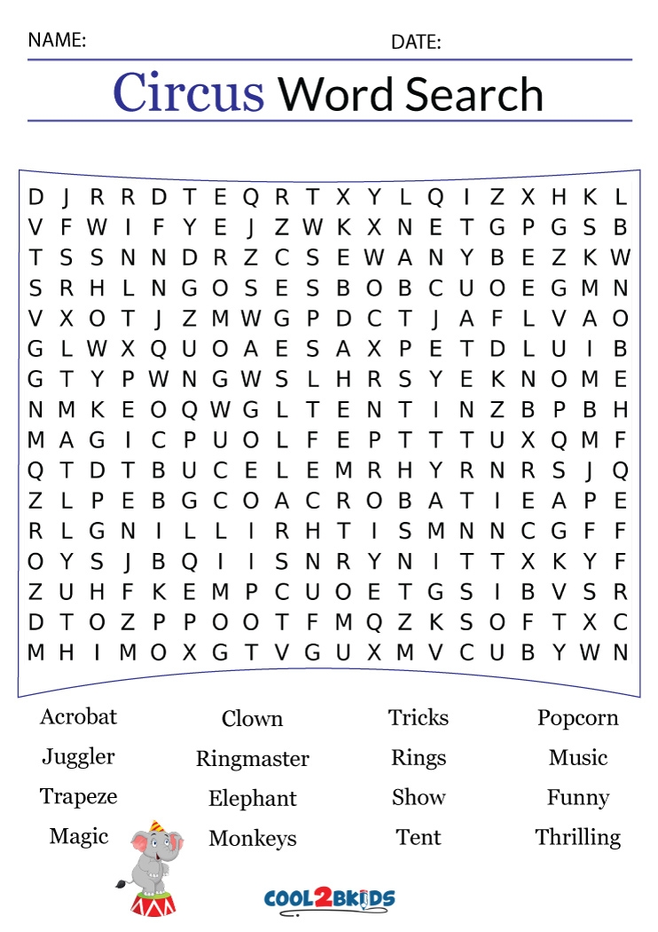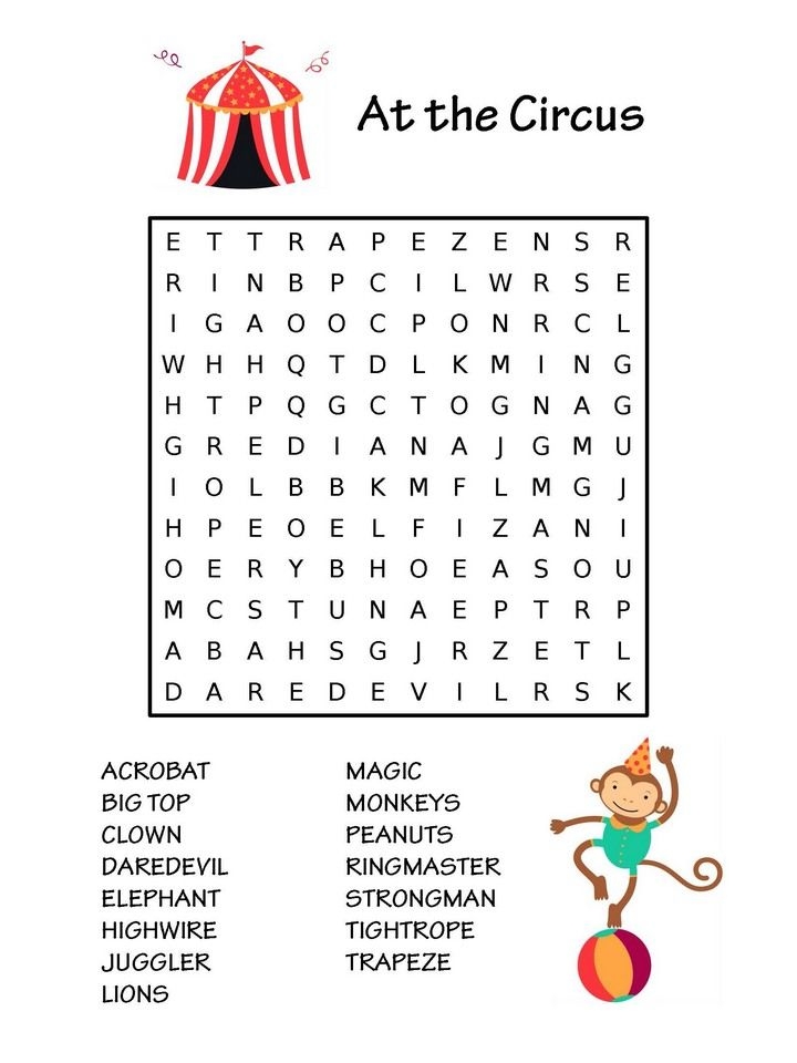 3. Circus Word Search: Print out a word search puzzle with circus-related words hidden in the grid. Players can race to see who can find all the words first.
