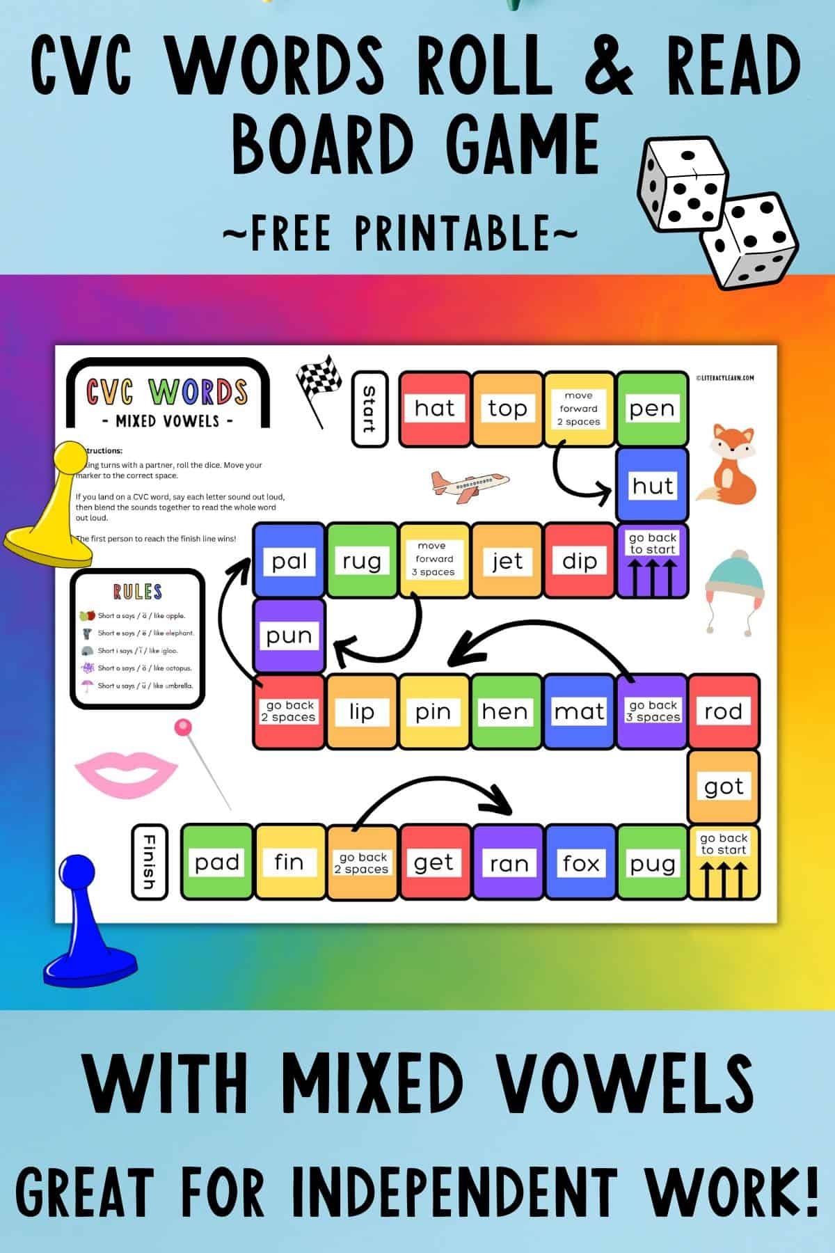 4. CVC Word Board Game: Create a board game where players move along a path by reading and spelling CVC words. Add in special spaces like “skip a turn” or “go back two spaces” to make it more exciting.