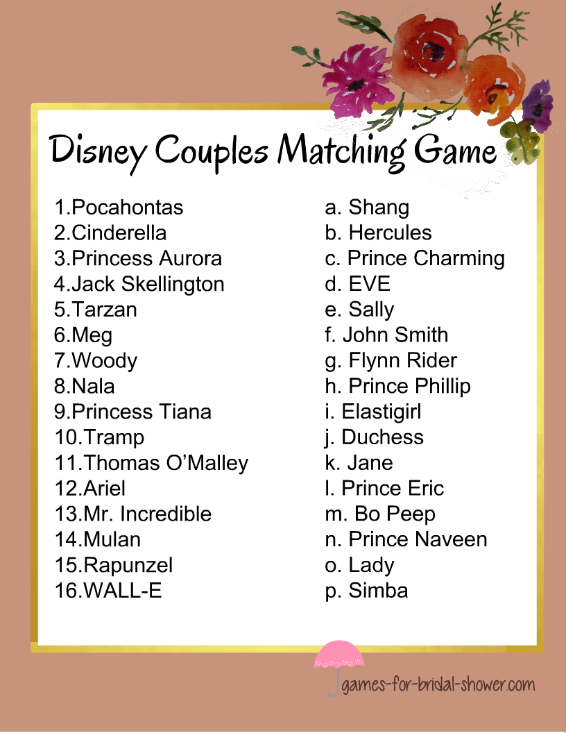 The game features various questions about famous Disney couples such as Cinderella and Prince Charming, Ariel and Prince Eric, and Belle and Beast. Your guests will have to match the correct couples together to win points and prizes.