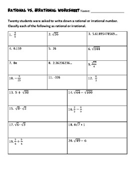 A typical irrational vs rational numbers worksheet might include questions such as: