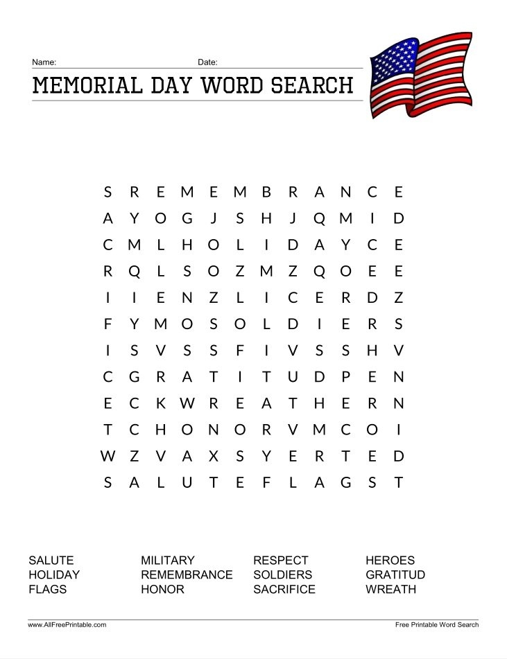 2. Word Searches: Memorial Day-themed word searches are a fun and educational activity for kids. These printable puzzles can help kids learn more about the history and significance of Memorial Day while improving their vocabulary and spelling skills. You can find a variety of free word search puzzles online that are perfect for kids of all ages.