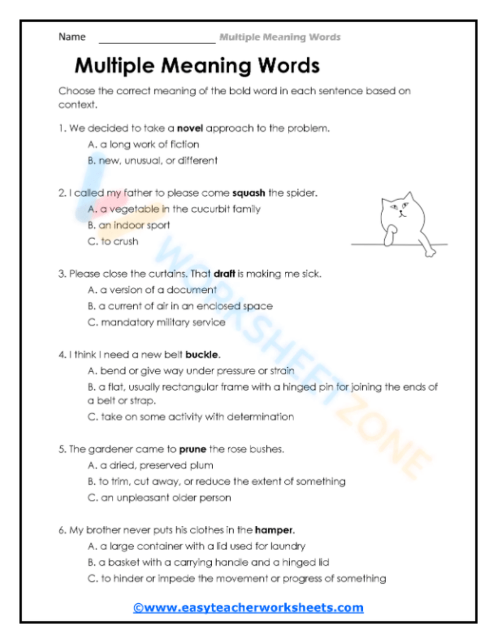 Additionally, teachers can provide printable worksheets with sentences that contain multiple meaning words. Students can identify the different meanings of the words in context and then write their own sentences using each meaning. This activity encourages critical thinking and improves students’ ability to interpret language.