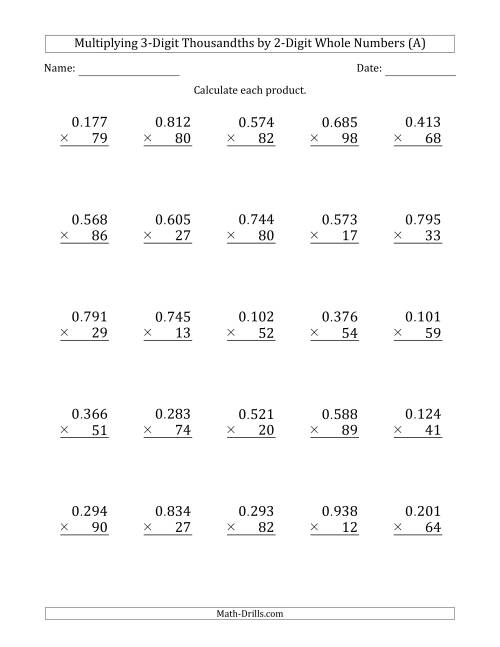 Multiplication of Whole Numbers and Decimals Worksheet