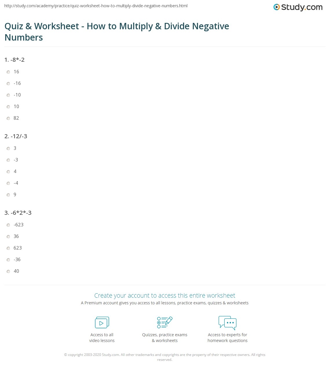 Quiz Worksheet How To Multiply Divide Negative Numbers Study