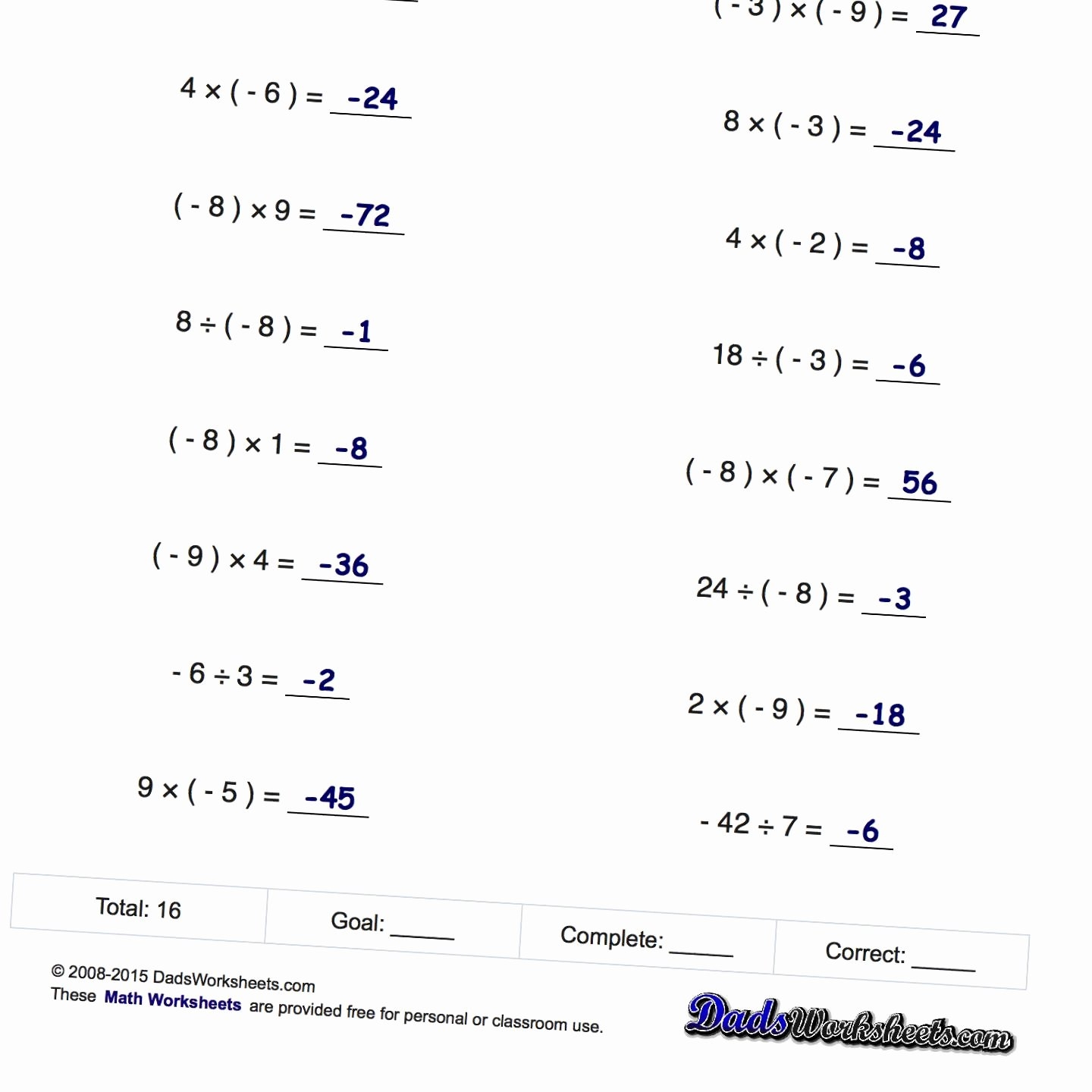 Multiplying Dividing Negative Numbers Worksheet