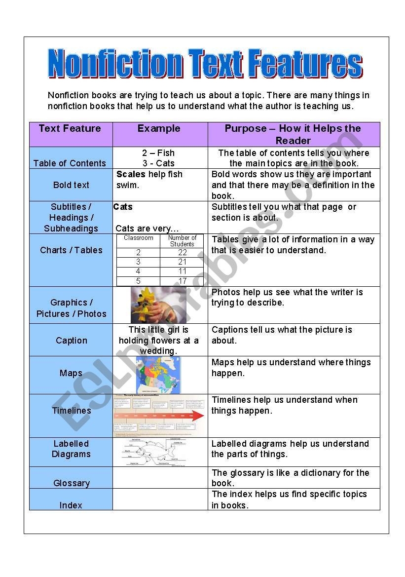 5. Text Feature Poster: Ask students to create a poster highlighting different text features and their importance. They can include examples of text features found in various informational texts and explain how each feature helps readers.