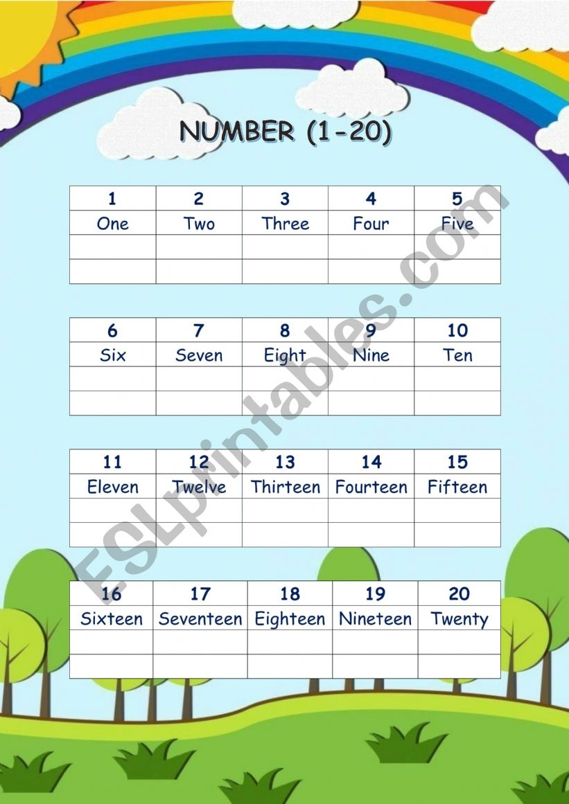 1. Number tracing worksheets: These worksheets are designed to help children practice writing numbers 1-20. They provide guided lines for children to trace the numbers and then space for them to write the numbers on their own.