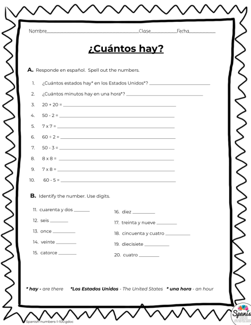 A numbers in Spanish 1-20 worksheet typically includes activities such as matching the Spanish number to its written form, filling in the missing numbers, and counting objects in Spanish. These exercises help learners become familiar with the numerical system in Spanish and improve their fluency in using numbers.