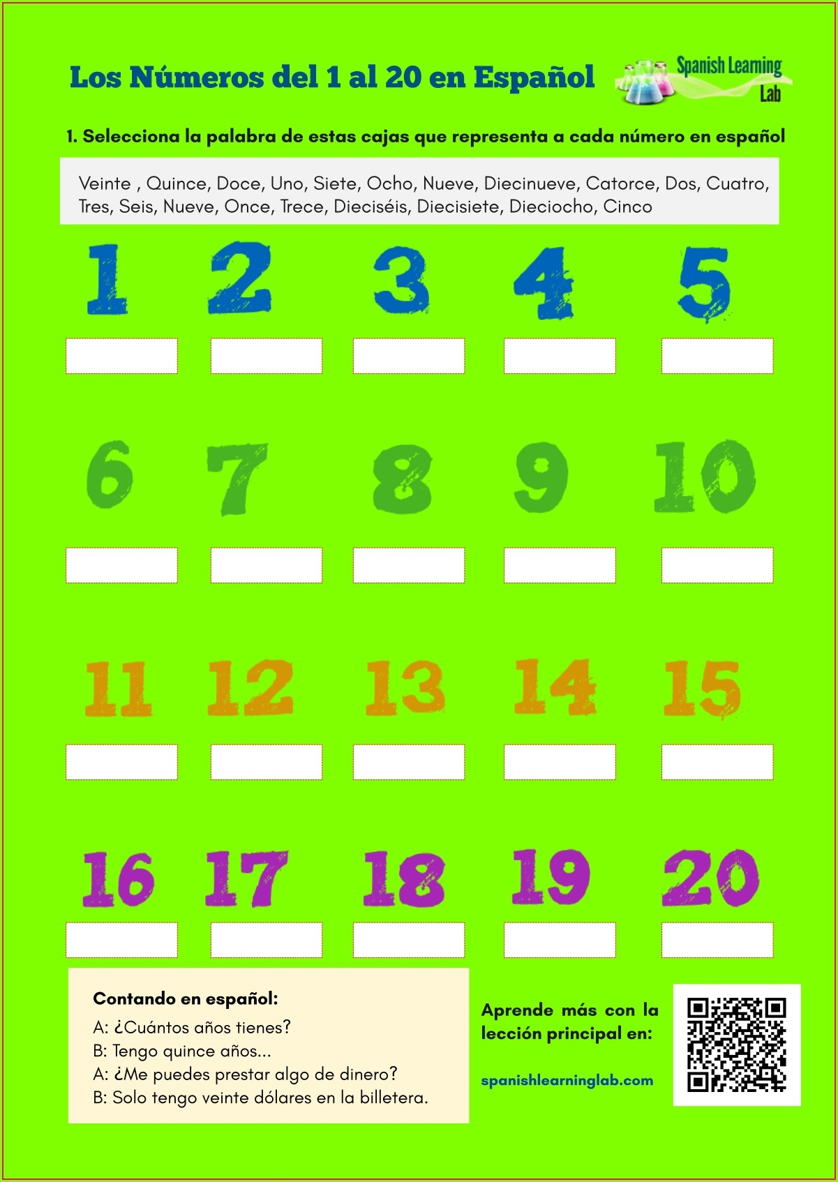 Numbers in Spanish 1-20 Worksheet