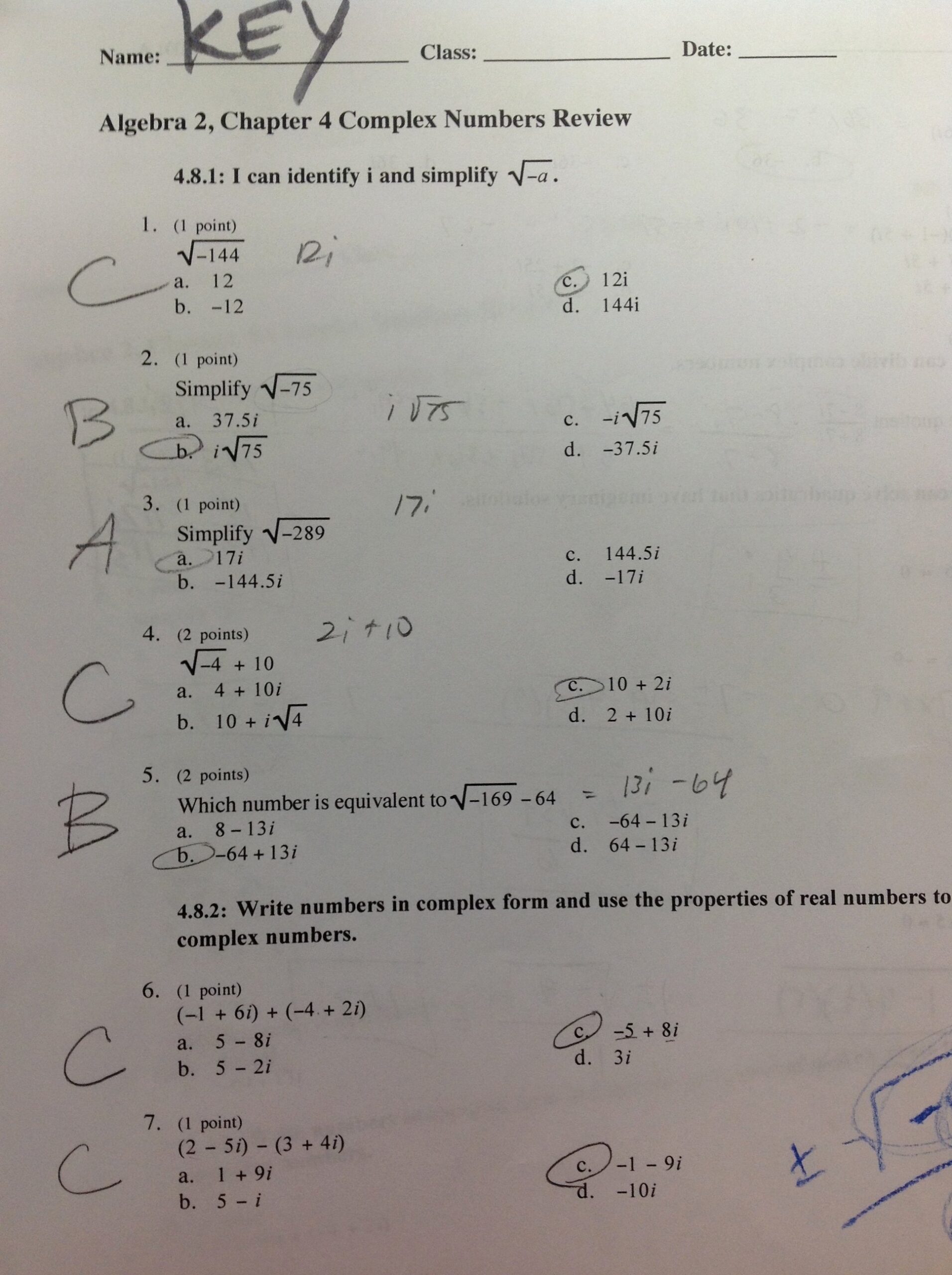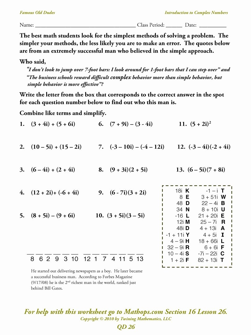 When working on a worksheet that involves operations with complex numbers, it is important to remember the rules for each operation. Addition and subtraction of complex numbers is similar to adding or subtracting polynomials. Simply combine like terms – add or subtract the real parts and the imaginary parts separately.