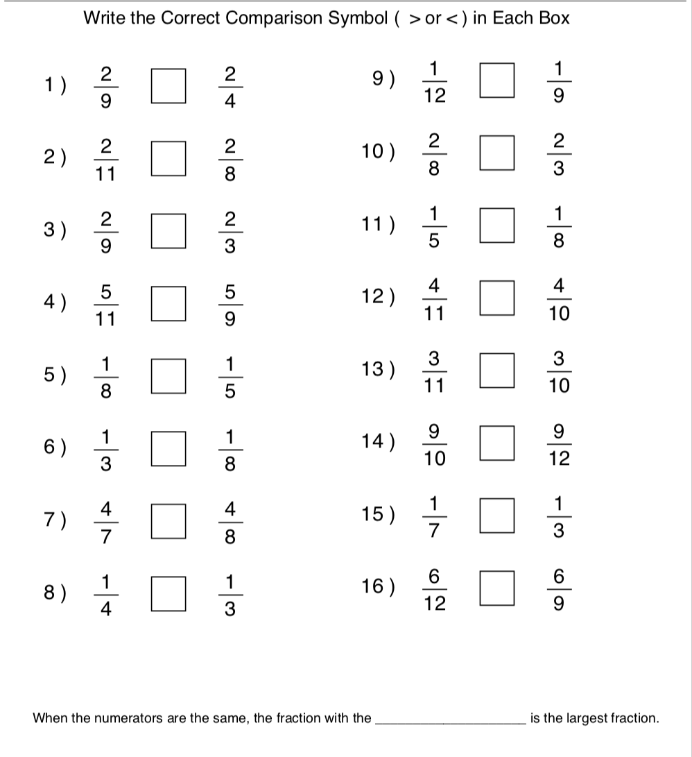 Another type of problem students may encounter on these worksheets is comparing fractions with different denominators. In this case, students must find a common denominator before comparing the fractions. This process helps reinforce the concept of equivalent fractions and the importance of having a common base for comparison.