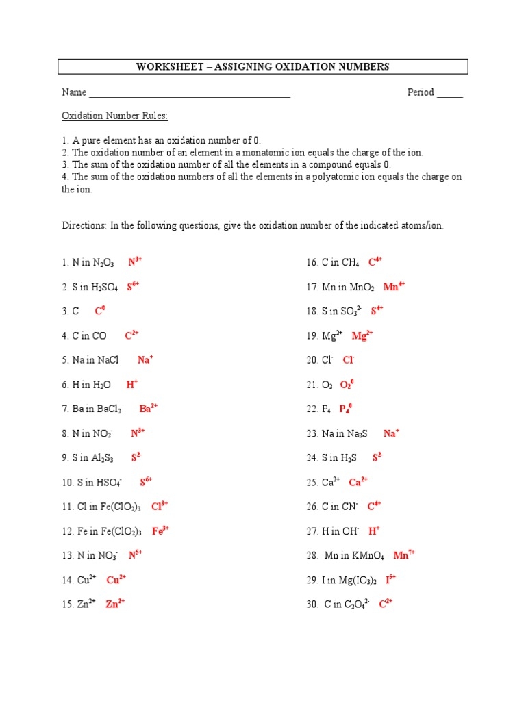Typically, an oxidation numbers worksheet will present students with a series of chemical compounds and ask them to determine the oxidation number of specific elements within each compound. This can involve identifying the oxidation number of elements in both simple and complex molecules, as well as in ions. Through practice, students can become more proficient in assigning oxidation numbers and applying this knowledge to predict chemical reactions.