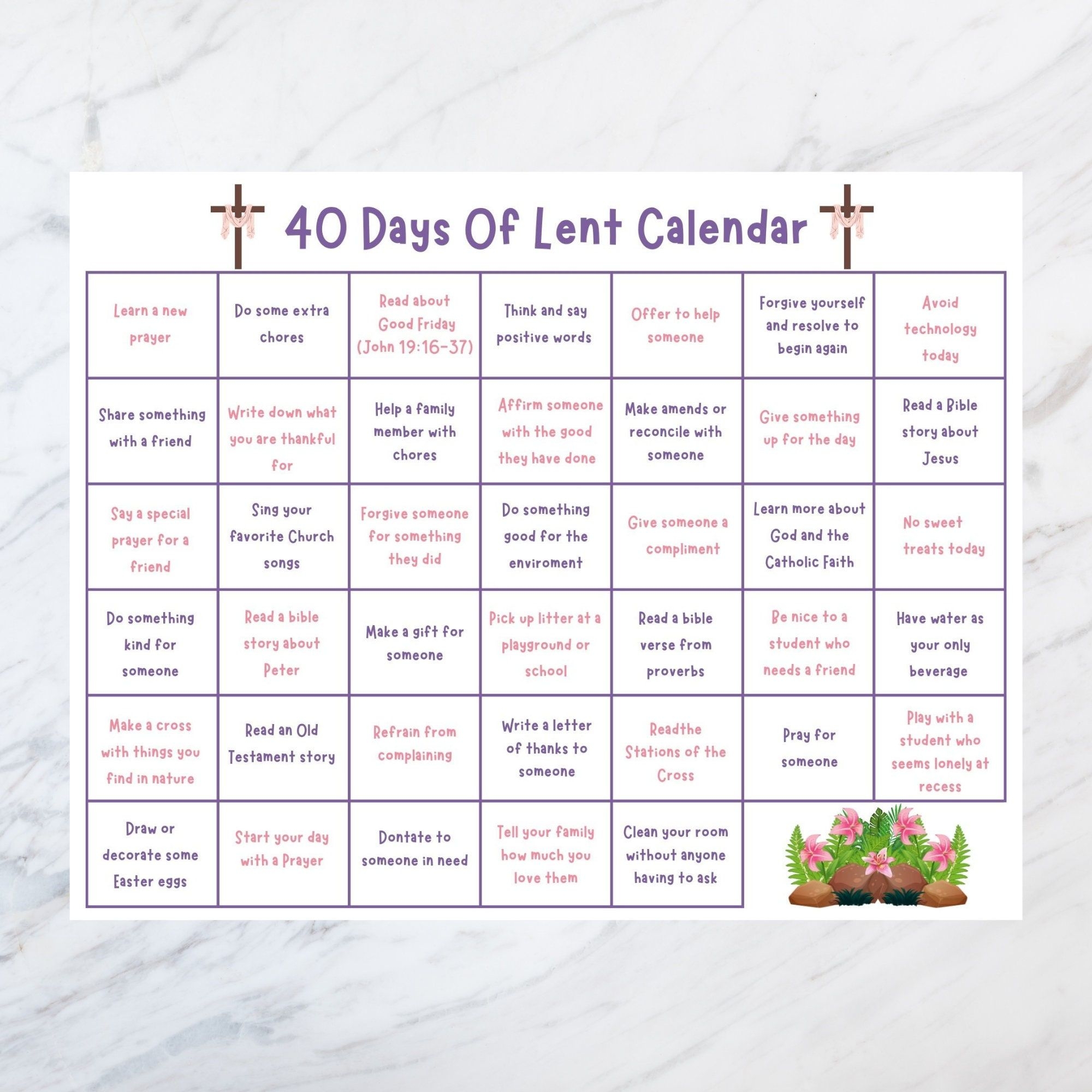 1. Lenten Calendar: A printable Lenten calendar can help you track the days of Lent and stay focused on your spiritual practices. It can include daily reflections, prayers, and activities to help you stay connected to your faith throughout the season.